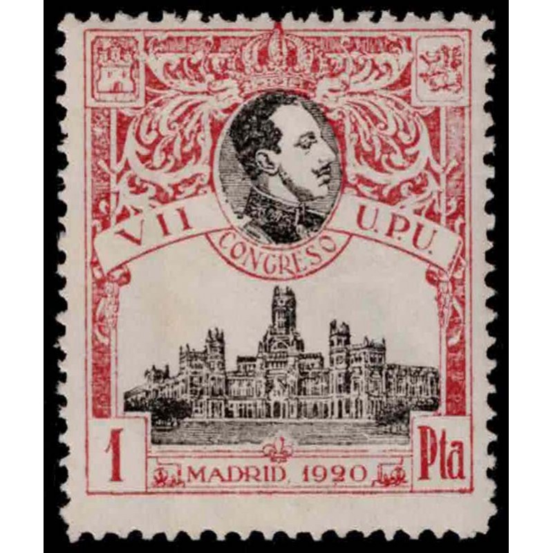 7. Weltpostcongreß in Madrid. König Alfons XIII und Gebäude der Post und Verkehrsverwaltung.