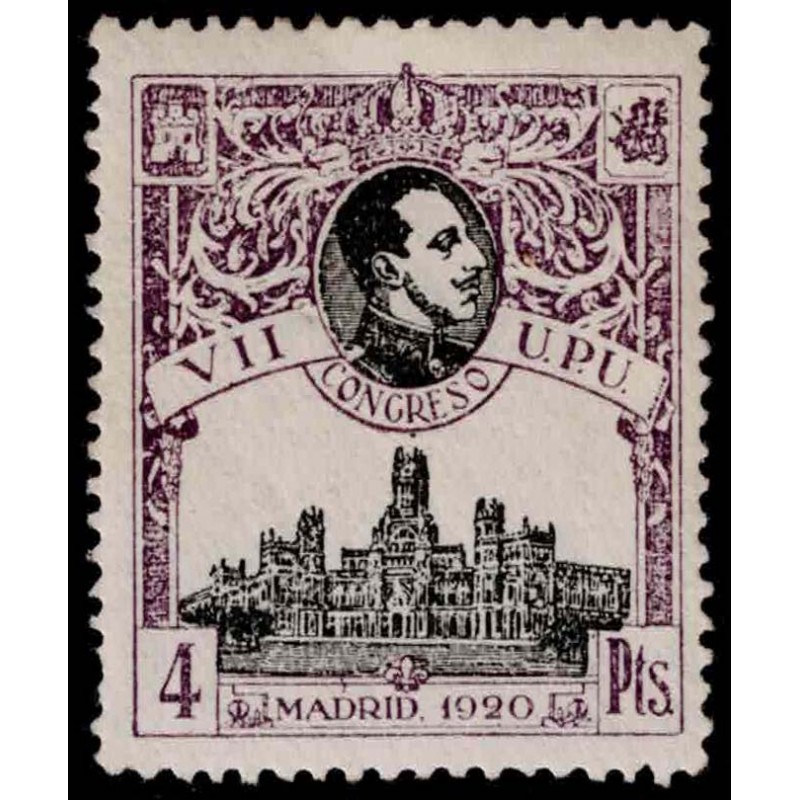 7. Weltpostcongreß in Madrid. König Alfons XIII und Gebäude der Post und Verkehrsverwaltung.