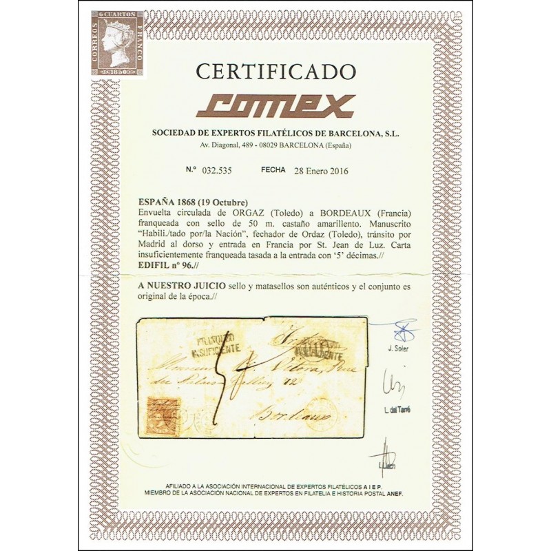 Zeitungsmarken und Königin Isabella II. Handschriftlicher-Aufdruck HABILITADO POR LA NACION. 1868 Orgaz (Toledo)-Bordeaux (Frankreich).