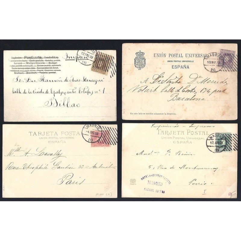 1903 Madrid-Paris (Frankreich), Bilbao, Barcelona. 4 Postkarten.