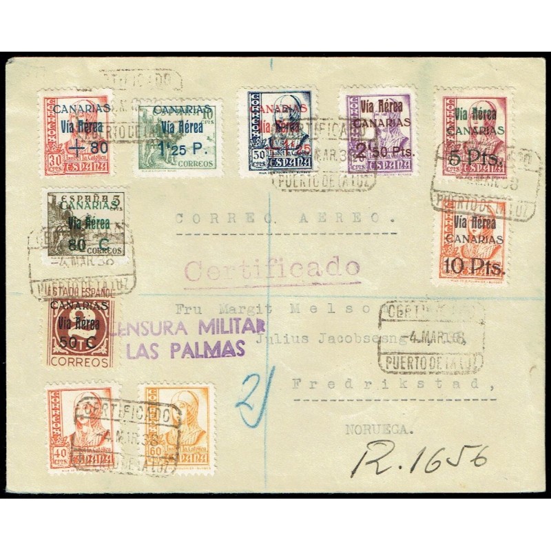 Nationale Briefmarken mit Aufdruck "Flugpost". 1938 Puerto de la Luz (Las Palmas)-Fredrikstad (Norwegen).