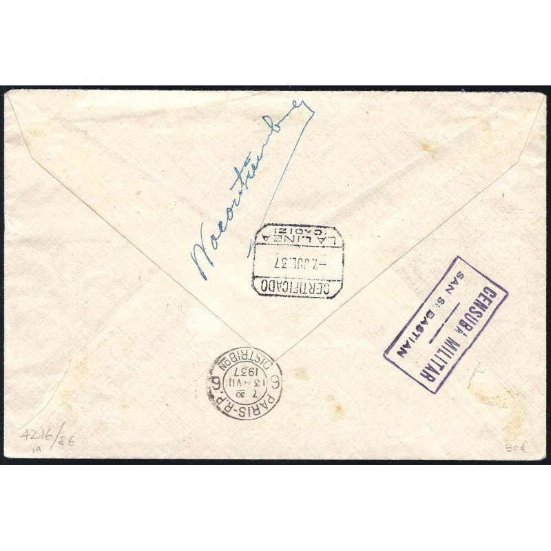 Republikanische Briefmarken mit Aufdruck. 1937 La Línea de la Concepción (Cádiz)-París (Frankreich).