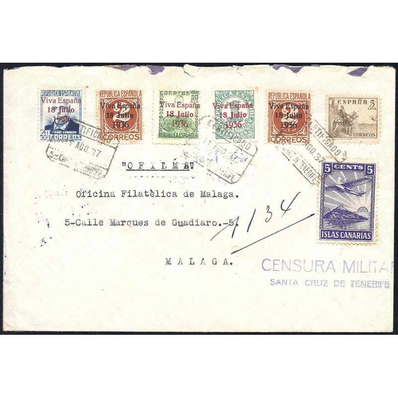 Republikanische Briefmarken mit Aufdruck. 1937 Santa Cruz de Tenerife (Kanarische Inseln)-Malaga.