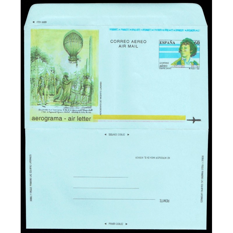Aerograms with printed stamp. June 4. 200 years anniversary of the air balloon flight in Madrid. Print ERROR: missing print in red and black color displaced.