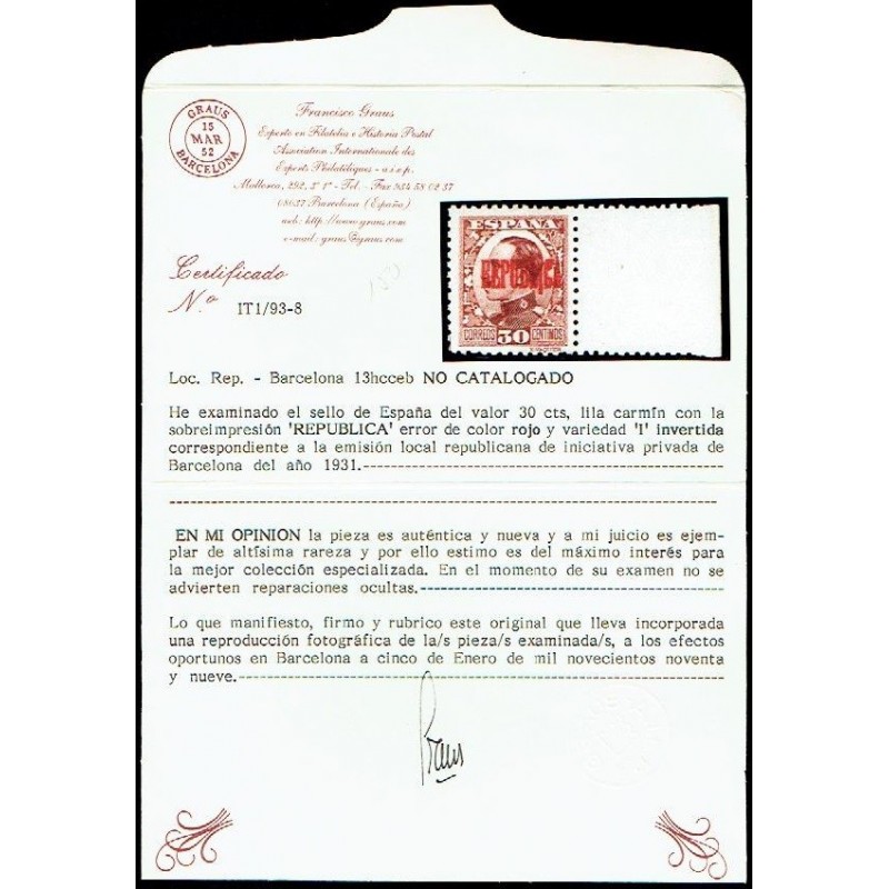 LOCAL WAR STAMPS AND CANARY ISLANDS AIR MAIL>Republican Local War Stamps>Barcelona>1931 ED. ELR Barcelona 13hccheb **