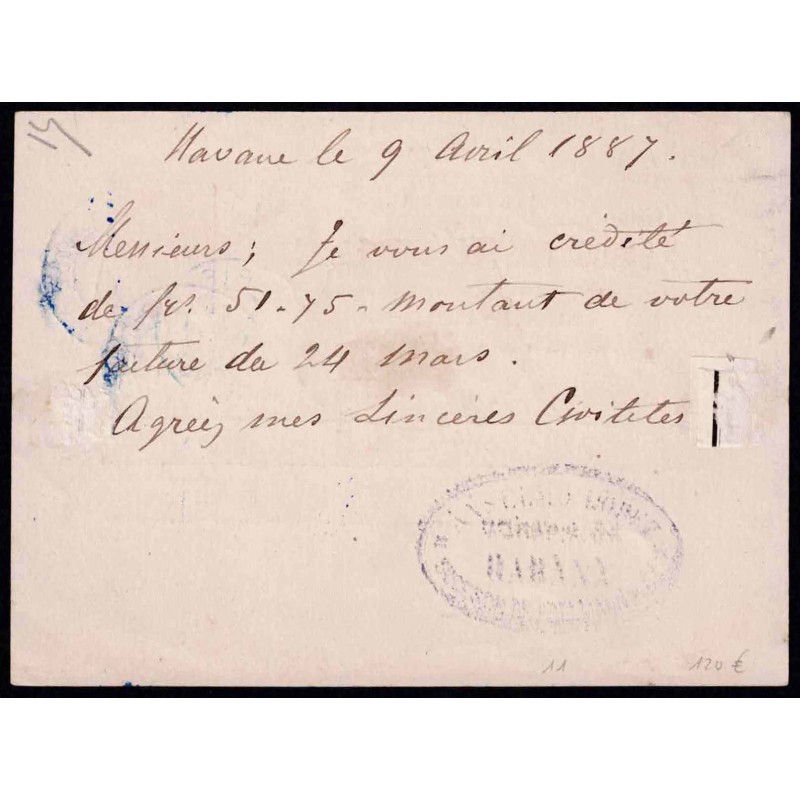 Alfonso XII. Caption "CUBA". Cards for the countries of the Universal Postal Union. 1887 Havana (Cuba)-Paris (France).