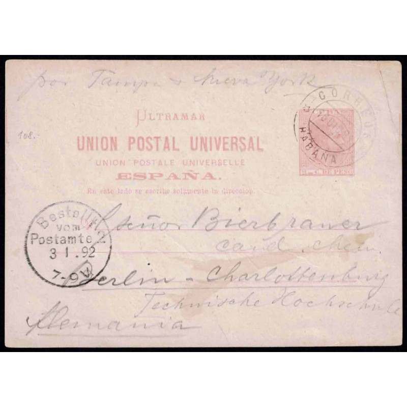 Alfonso XII. Caption "CUBA". Cards for the countries of the Universal Postal Union. 1891 Havana (Cuba)-Berlin (Germany).