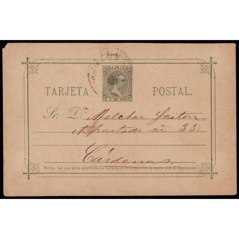 Alfonso XIII. Child type. Caption "ISLA DE CUBA". 1891 Destination Cardenas (Cuba).