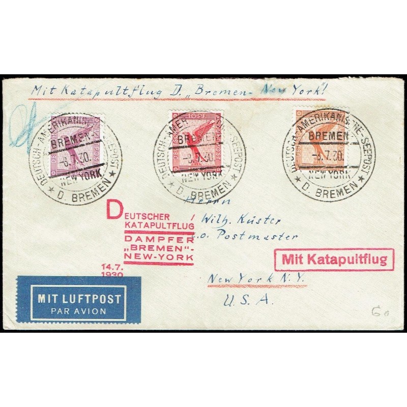 1930 Destination New York (United States). Catapult-flight steamer "Bremen" to New York.