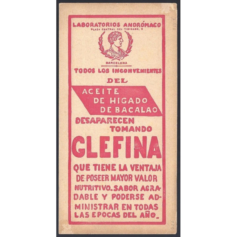Alfonso XIII. Vaquer. LABORATORIOS ANDRÓMACO, S.A. Plaza Central del Tibidabo. Barcelona. Innen Post Barcelona. Laiz 490.