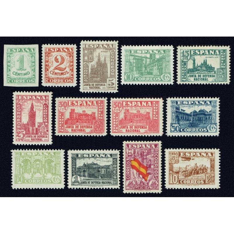 Numerals and cityscapes, inscription "ESPAÑA CORREOS / JUNTA DE DEFENSA NACIONAL".