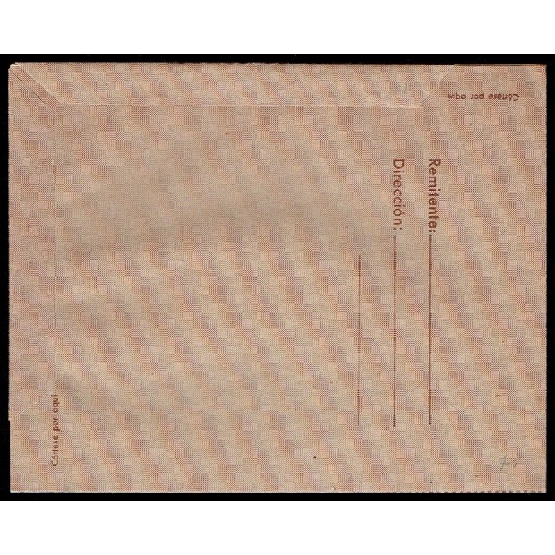 Carta-Sobre Avión. Modelo para correspondencia aérea 1,30p. castaño sobre castaño claro. Dibujo de Mariano Bertuchi, "El Jinete". Impreso en huecograbado offset por Rieusset. S.A., Barcelona. Tirada de 20000. Matasellos de favor de Tetuán (Marruecos) del 1 de Enero de 1949 (Primer Día). Raro.