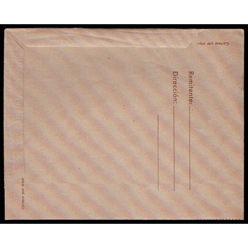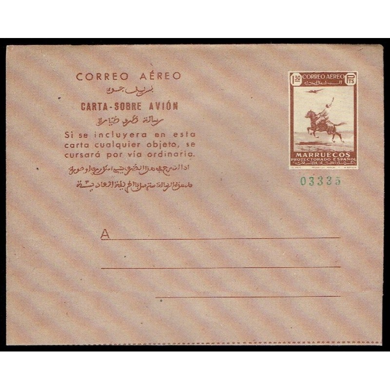 Carta-Sobre Avión. Modelo para correspondencia aérea 1,30p. castaño sobre castaño claro. Dibujo de Mariano Bertuchi, "El Jinete". Impreso en huecograbado offset por Rieusset. S.A., Barcelona. Tirada de 20000. Raro.
