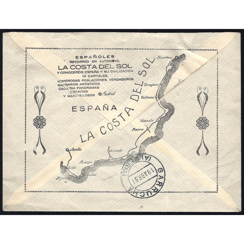Sellos de 1920 y 1930-1931 sobrecargados. Carta circulada de Almería a Garrucha (Almería) el 18 de Abril de 1931. Franqueada con 1, 2, 10 y 15 céntimos, más un 5c. negro de Derecho de Entrega. Rarísimos sobre carta circulada. Matasellada con fechadores de origen y de llegada el día 19. Sobre con membrete del "Hotel Simón" y publicidad de la "Costa del Sol" en el reverso.