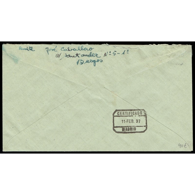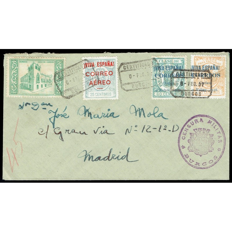 Sellos fiscales sobrecargados. Carta certificada circulada de Burgos a Madrid el 6 de Febrero de 1937. Matasellada con fechadores de origen y de llegada el día 11. Marca de censura militar. Viñeta "Burgos - Casa del Cordón".