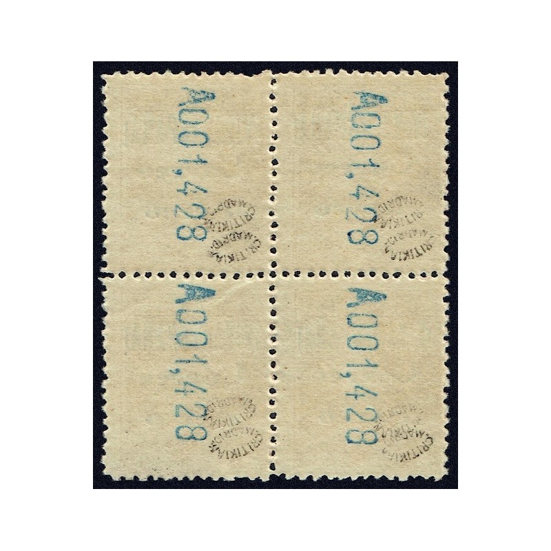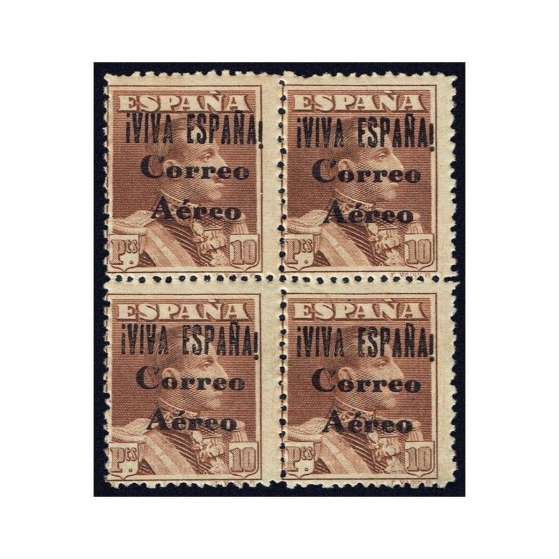 Sellos monárquicos y republicanos sobrecargados aéreos. Muy raro 10 pesetas castaño amarillo en bloque de 4 con habilitación Tipo I en negro. Numeración A. 001,428. Doble marquilla Critikian. No catalogado sin señal de fijasellos.