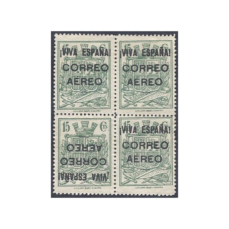 Sellos fiscales sobrecargados aéreos. Precioso bloque de 4 del 15c. verde grisáceo con error de impresión en la pareja inferior con un sello con habilitación invertida. No catalogado sin señal de fijasellos. Raro.