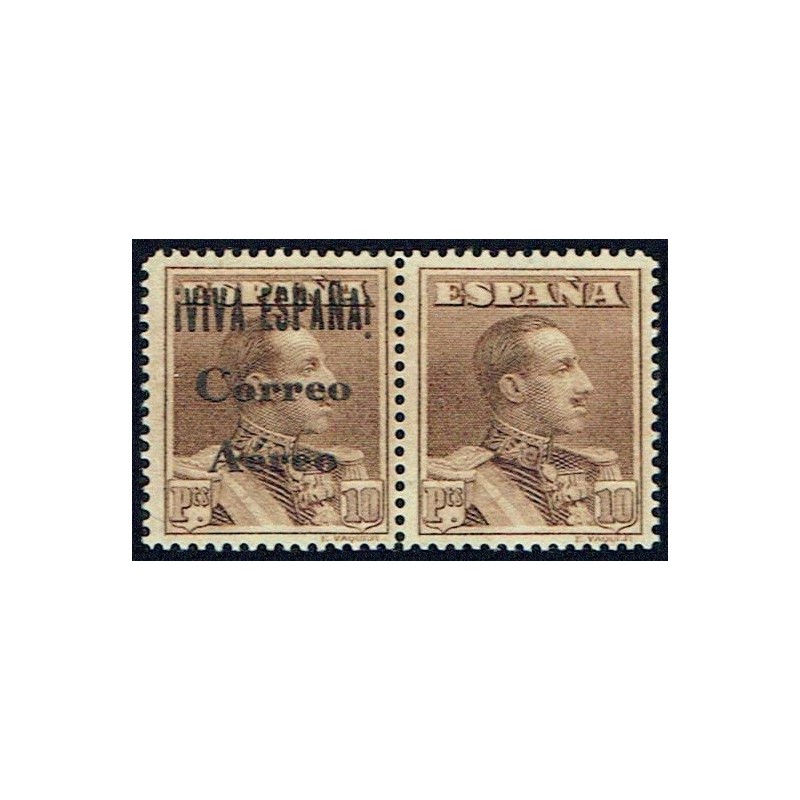 Sellos monárquicos y republicanos sobrecargados aéreos. Precioso 10 pesetas castaño amarillo en pareja horizontal, un sello con habilitación Tipo II y el otro carente de ella presenta señal de fijasellos. Numeración A 001,630. Marquilla Sanabria. No catalogado. Sólo 3 o 4 piezas conocidas.
