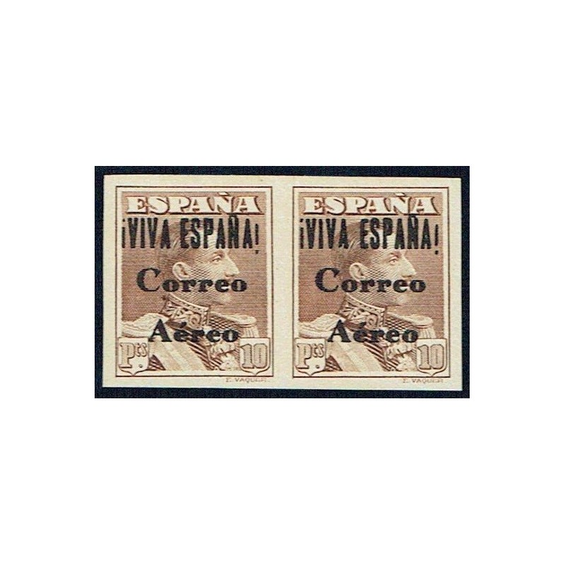 Sellos monárquicos y republicanos sobrecargados aéreos. Precioso 10 pesetas castaño amarillo en pareja horizontal sin dentar y sin goma con habilitación Tipo II en negro. Valor clave de la serie. Muy raro.