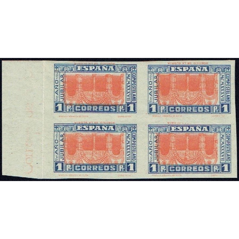Año Jubilar Compostelano. Rarísimo error de impresión en bloque de 4 sin dentar con el centro invertido y variedad de reporte en el cuarto sello sin la palabra "PÓRTICO" presenta buenos márgenes y borde de hoja lateral. No catalogado.