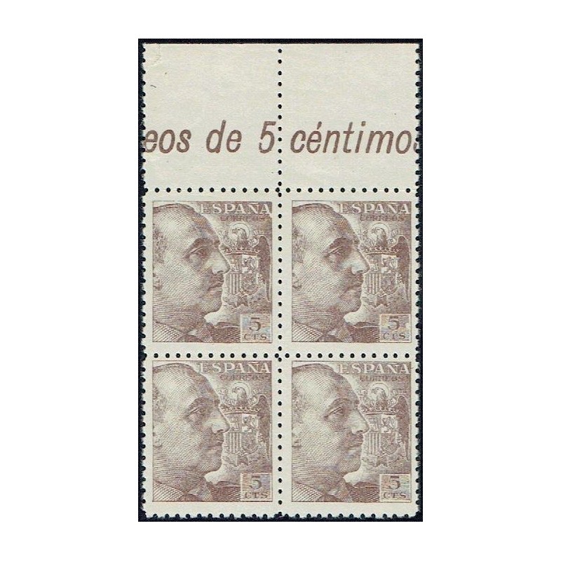 General Franco y escudo de España. Rarísimo bloque de 4 variedad de perforación dentado 10, de línea, presenta borde de hoja superior con leyenda y magnífico centraje.