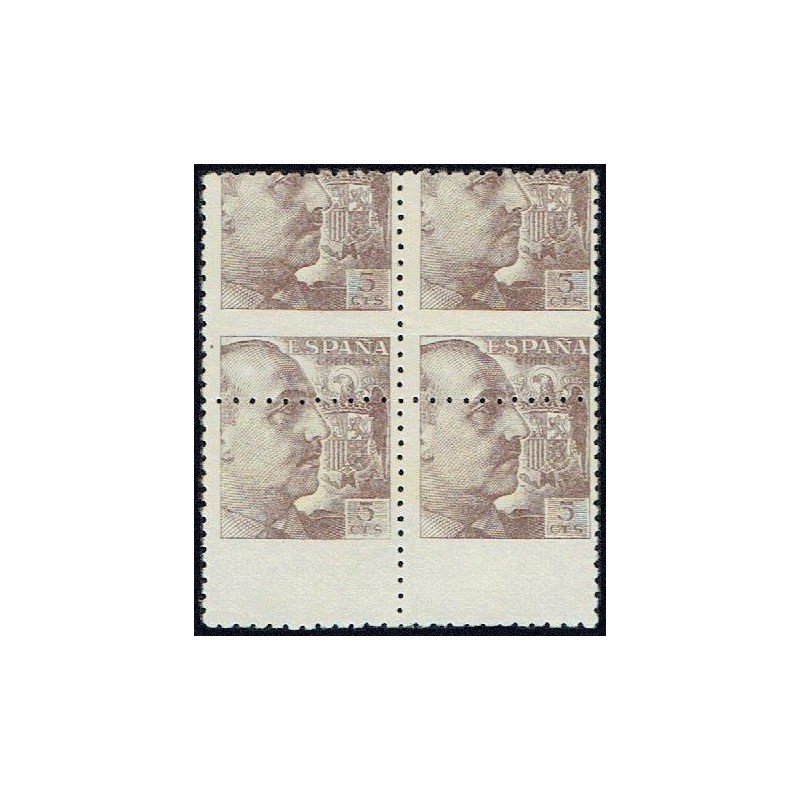 General Franco y escudo de España. Precioso bloque de 4 variedad de perforación con el dentado horizontal desplazado.