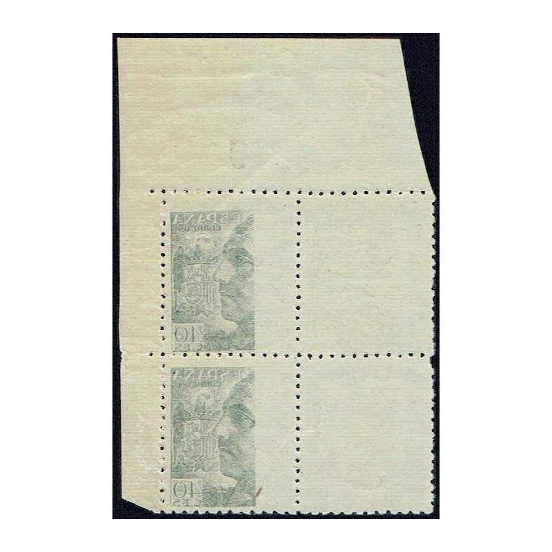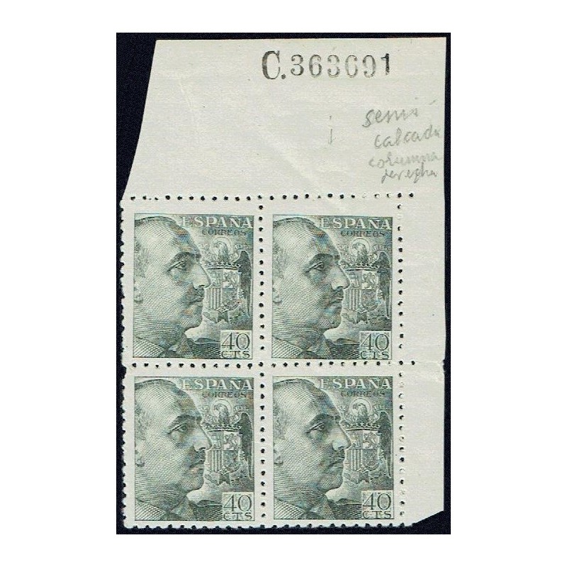General Franco y escudo de España. Precioso bloque de 4 con la columna de la derecha variedad de impresión calcada al reverso presenta esquina de pliego superior.