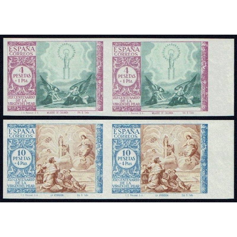 XIX Centenario de la venida de la Virgen del Pilar a Zaragoza. Muy rara serie completa en parejas horizontales sin dentar presenta amplios márgenes y borde de hoja lateral. Tirada de 1.000 ejemplares. Lujo.