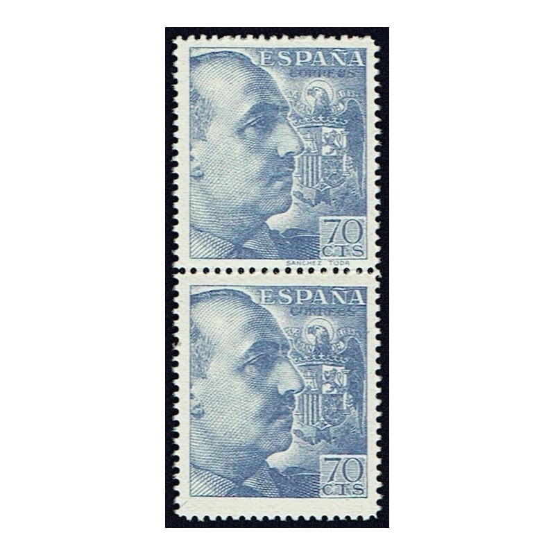 General Franco y escudo de España. Preciosa pareja vertical con dentado 14, de línea y variedad en el valor superior con pie de imprenta "SÁNCHEZ TODA".