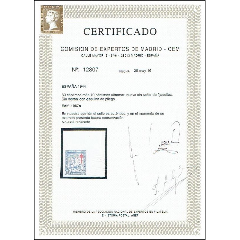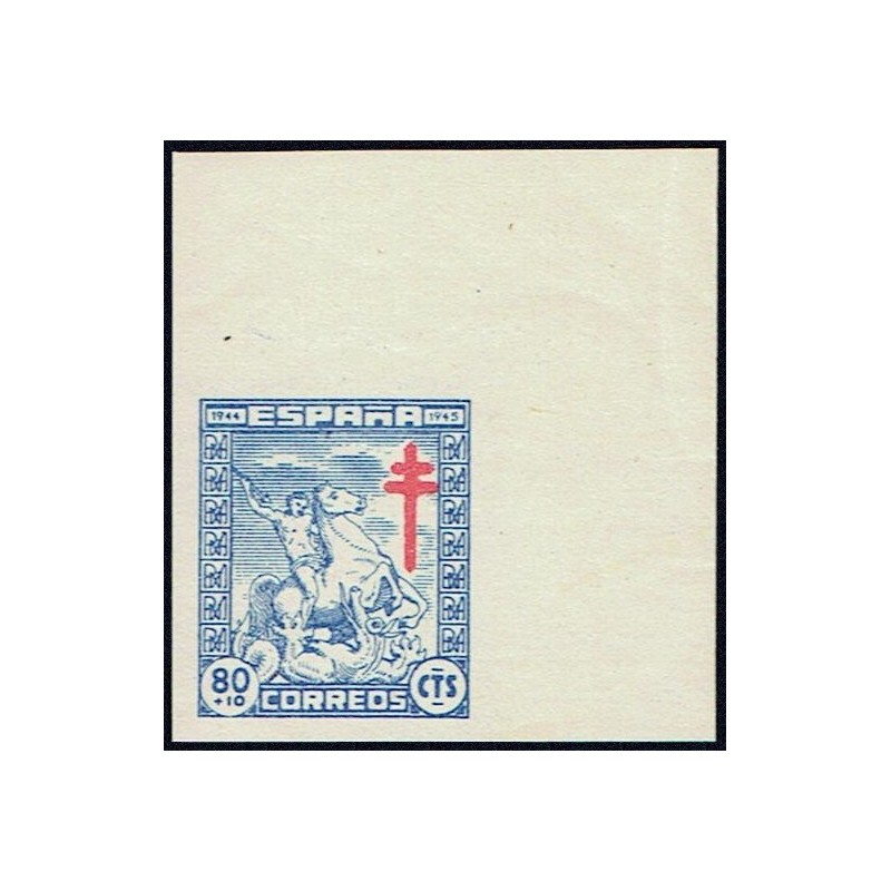 Pro Tuberculosos 1944. Precioso ejemplar sin dentar presenta amplios márgenes y esquina de pliego. Uno de los sellos más raros sin dentar del Estado Español. Muy pocos conocidos. Lujo. Certificado C.E.M.