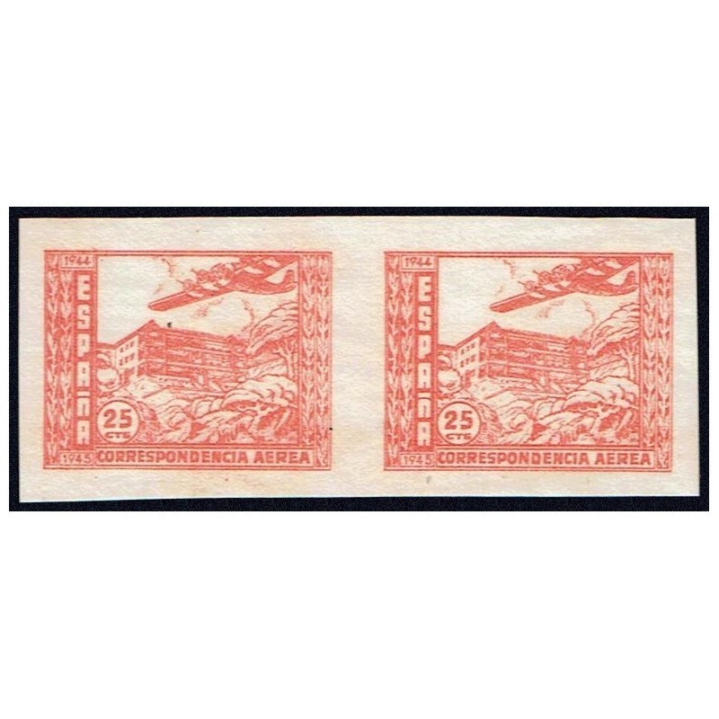 Pro Tuberculosos 1944. Correo aéreo. Preciosa pareja horizontal sin dentar con error de impresión sin la Cruz de Lorena presenta amplios márgenes.