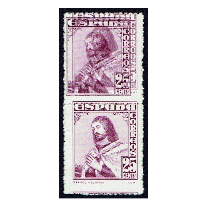 Fernando III el Santo y Almirante Bonifaz. Preciosa y rara variedad presenta el valor superior con error de impresión doble y el inferior con el dentado horizontal desplazado. Sólo 10 parejas posibles.