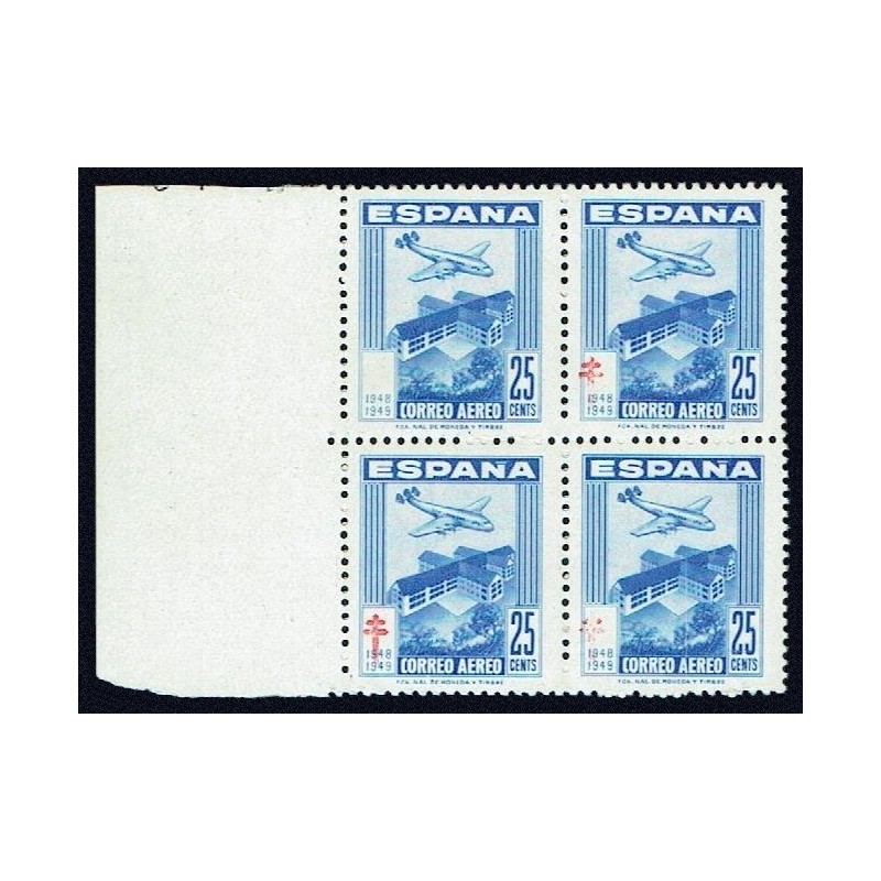 Pro Tuberculosos 1948. Rarísimo bloque de 4 con borde de hoja lateral presenta error de impresión sin Cruz de Lorena en el primer valor y variedad de impresión en el resto con la Cruz de Lorena mutilada. No catalogado.