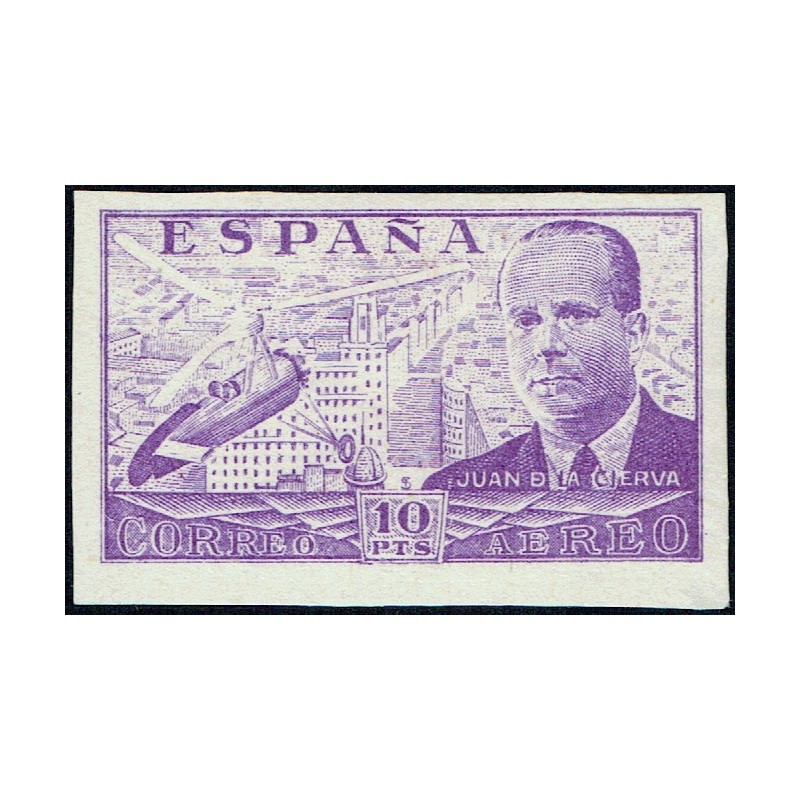 Juan de la Cierva (II). Correo aéreo. Rarísimo 10 Ptas. lila sin dentar presenta señal de fijasellos. Sello no catalogado con márgenes holgados y sin rastro de dentado, teniendo en cuenta la proximidad de estos sellos de la 2da serie en sus pliegos originales. Según el criterio de las comisiones de expertos C.E.M. y Comex al no ser conocida pareja, se abstienen de certificarlo y así lo ofertamos.