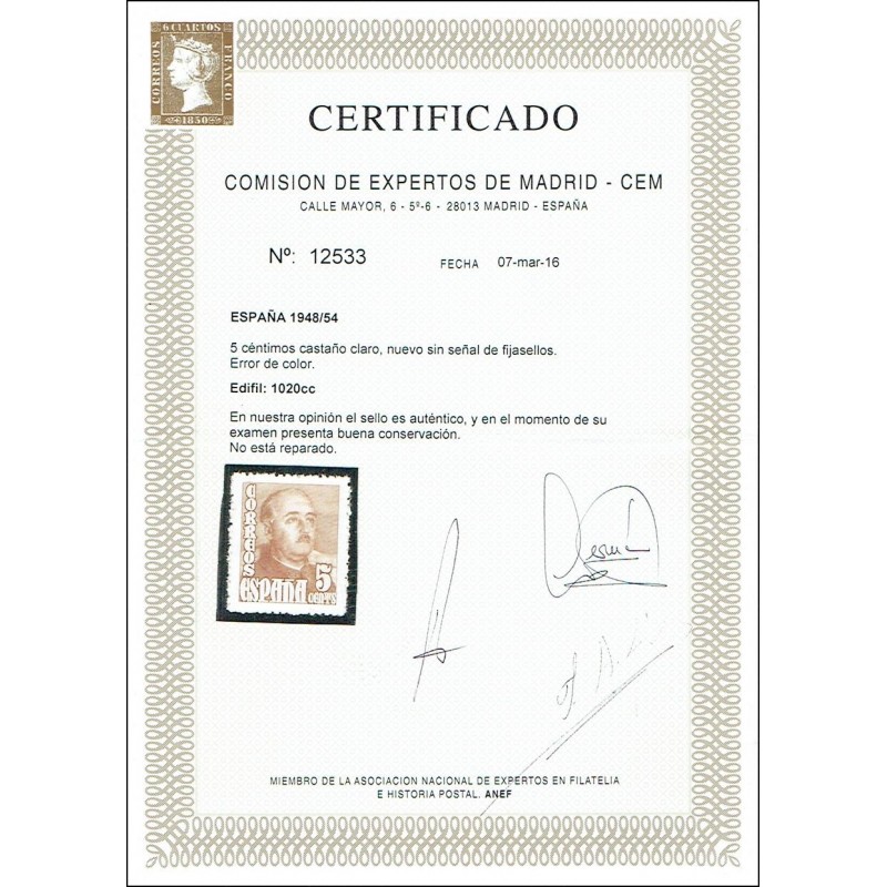 General Franco. Rarísimo cambio de color ocre amarillo (color del 50 céntimos). No catalogado. Se conocen menos de media docena de ejemplares. Lujo. Certificado C.E.M.