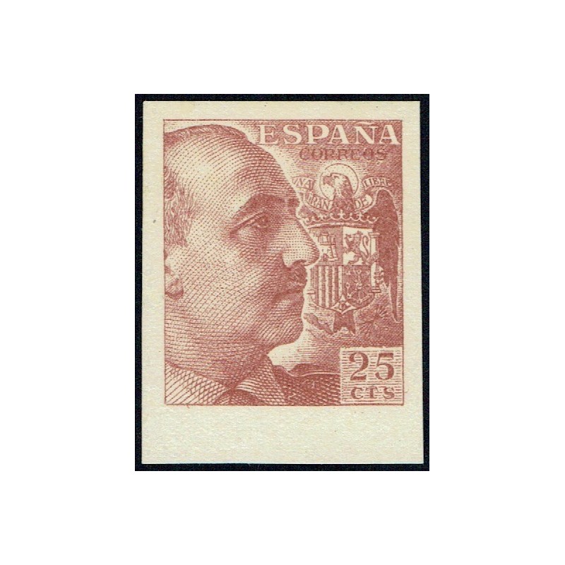 General Franco y escudo de España. Precioso cambio de color castaño rojizo sin dentar con borde hoja inferior y ligerísima señal de fijasellos presenta amplios márgenes. Lujo.