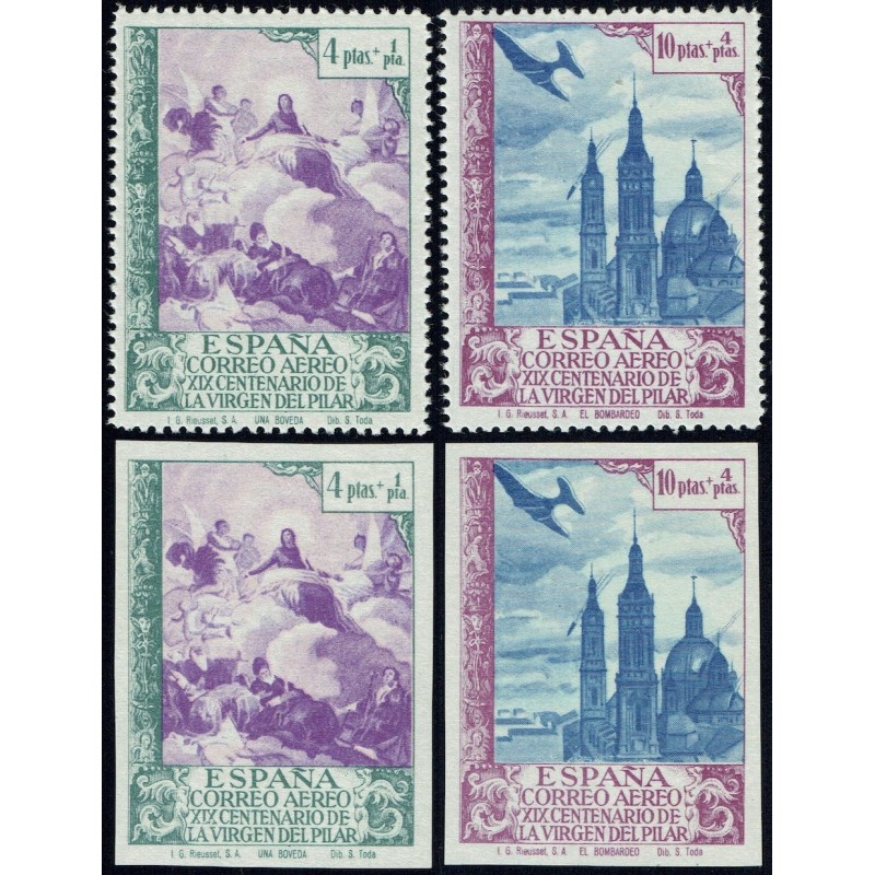 XIX Centenario de la venida de la Virgen del Pilar a Zaragoza. Correo aéreo. Precioso juego completo de colores cambiados, serie dentada y sin dentar. Tiradas de 1.000 series de cada una. No catalogadas sin señal de fijasellos. Lujo.