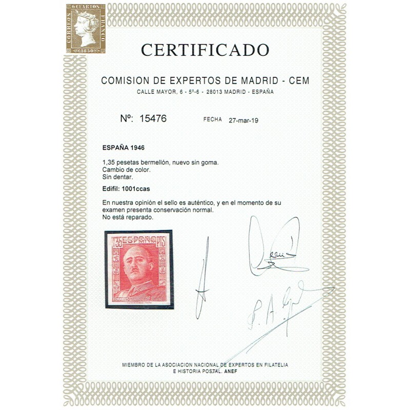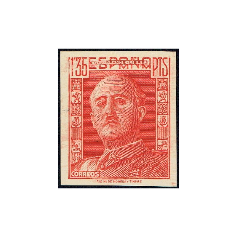 General Franco, de frente. Rarísimo cambio de color bermellón sin dentar y sin goma del 1,35 Pesetas violeta presenta amplios márgenes. Lujo. Certificado C.E.M.