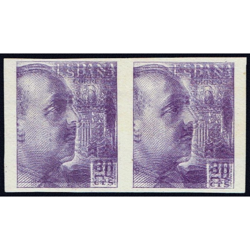 General Franco y escudo de España. Rara pareja horizontal sin dentar con doble impresión. No catalogada.