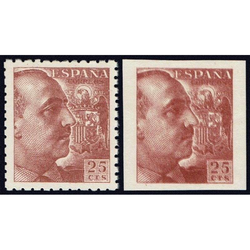 General Franco y escudo de España. Preciosos dos cambios de color castaño rojizo en dentado y sin dentar con señal de fijasellos.