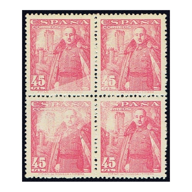 General Franco y castillo de la Mota. Precioso bloque de 4 variedad con defecto de impresión resultando como un velo sobre el centro de la pieza. No catalogada.