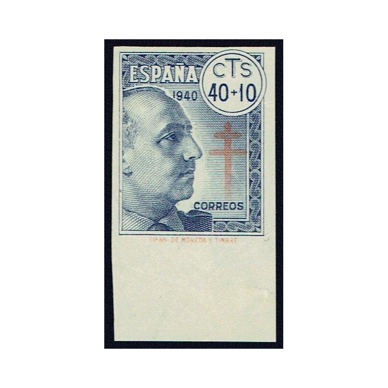 Pro Tuberculosos 1940. Precioso ejemplar sin dentar con error de reporte pie de imprenta "Fca Nal DE MONEDA Y TIMBRE" impreso en el mismo color que la cruz presenta borde de hoja inferior y señal de fijasellos.