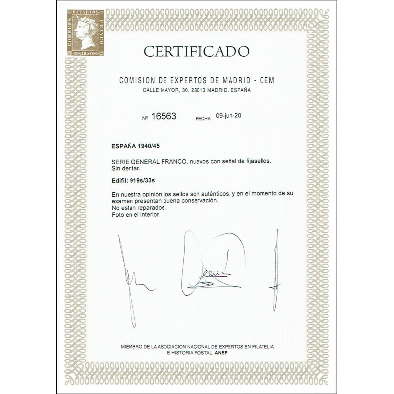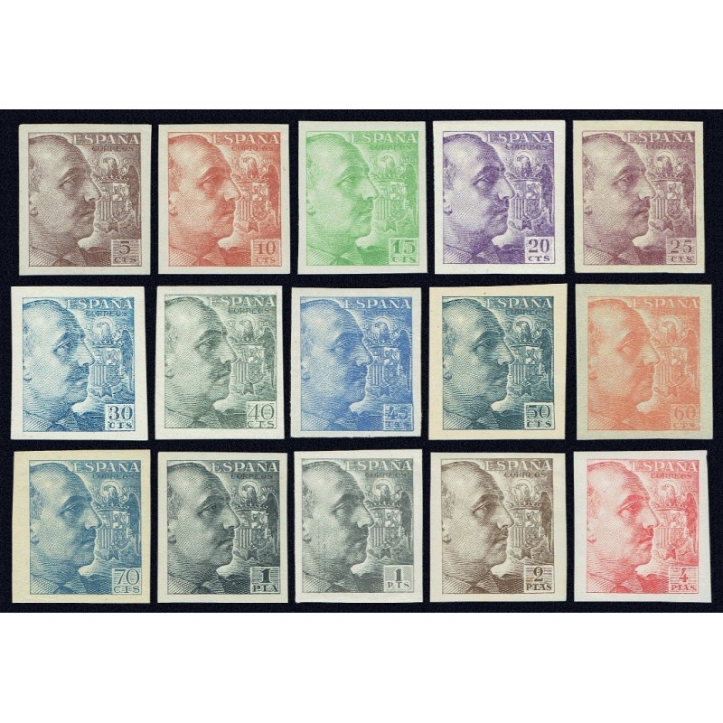 General Franco y escudo de España. Preciosa serie completa sin dentar con señal de fijasellos. Lujo. Certificado C.E.M.