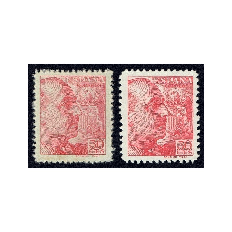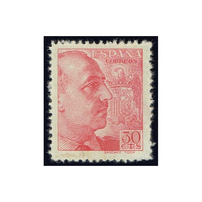 General Franco y escudo de España. Muy raro 30 cts. de color y dentado diferente. El color debido a un grabado muy fino y el dentado de 11 1/4 (horizontal) x 11 1/2 (vertical), en lugar de 10 o 10 1/4, presenta en el reverso esquina izquierda inferior descarnada. No catalogado.