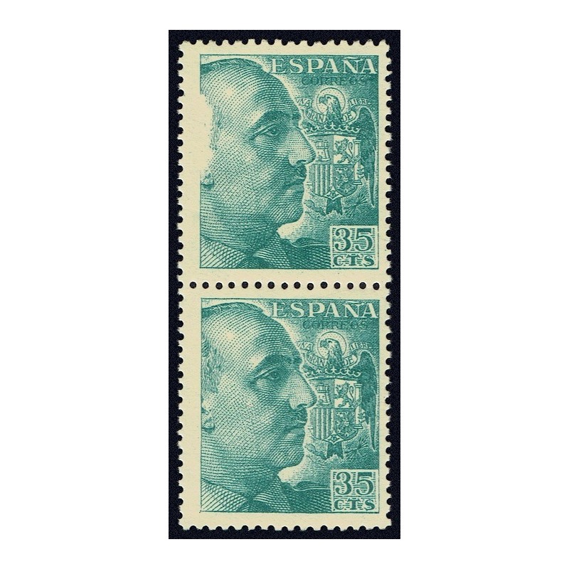 El Cid y General Franco. Preciosa pareja vertical presenta variedad de impresión parcial en el margen izquierdo del sello superior. No catalogada.