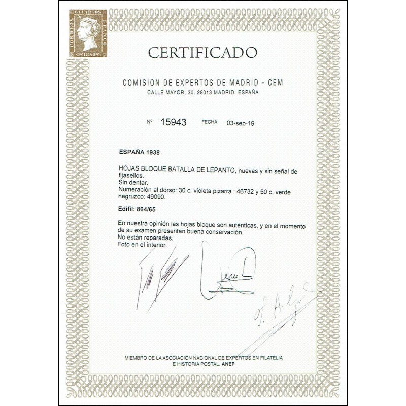 Batalla de Lepanto. Preciosa serie completa de hojitas sin dentar. Lujo. Certificado C.E.M.
