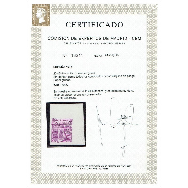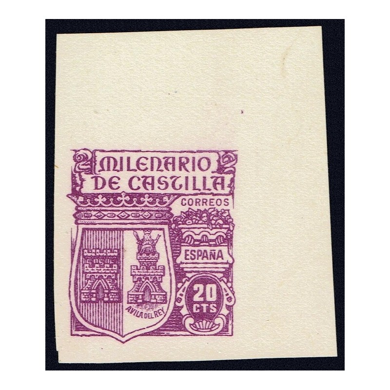 Milenario de Castilla. Rarísimo ejemplar sin dentar y sin goma presenta esquina de pliego superior y buenos márgenes. Lujo. Certificado C.E.M.