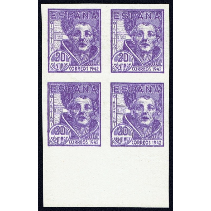 IV Centenario del nacimiento de San Juan de la Cruz. Precioso bloque de 4 sin dentar con error de impresión doble presenta amplios márgenes y borde de hoja inferior.