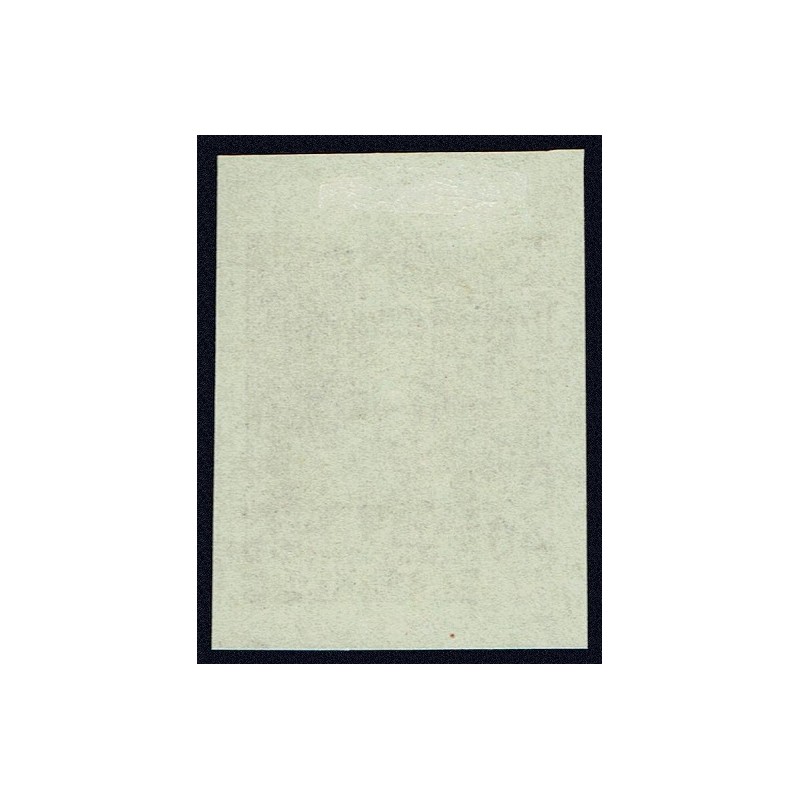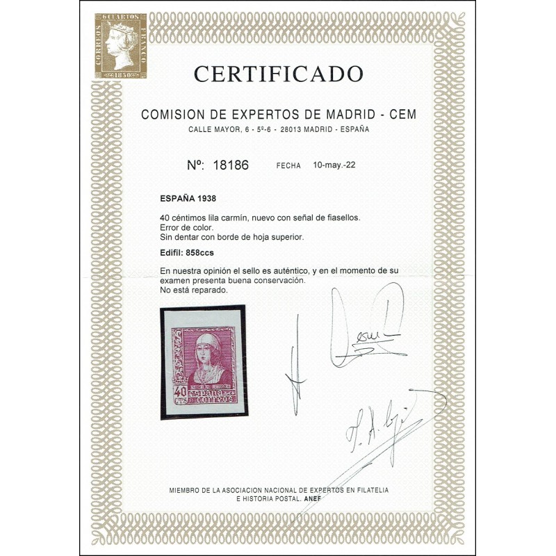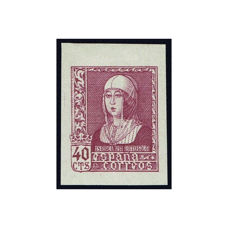 Isabel la Católica. Precioso cambio de color lila carminado sin dentar presenta amplios márgenes y señal de fijasellos en el borde de hoja superior que no afecta al dibujo. Muy pocos ejemplares conocidos. No catalogado. Certificado C.E.M.