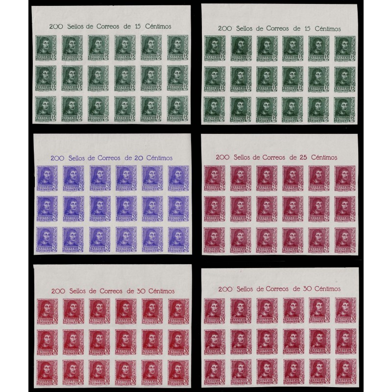 Fernando el Católico. Magnífica serie completa sin dentar en bloque de 18 con borde de hoja superior, amplios márgenes y misma leyenda "200 Sellos de Correos de (15 ó 20 ó 25 ó 30) Céntimos". Espectacular pieza. Gran lujo.